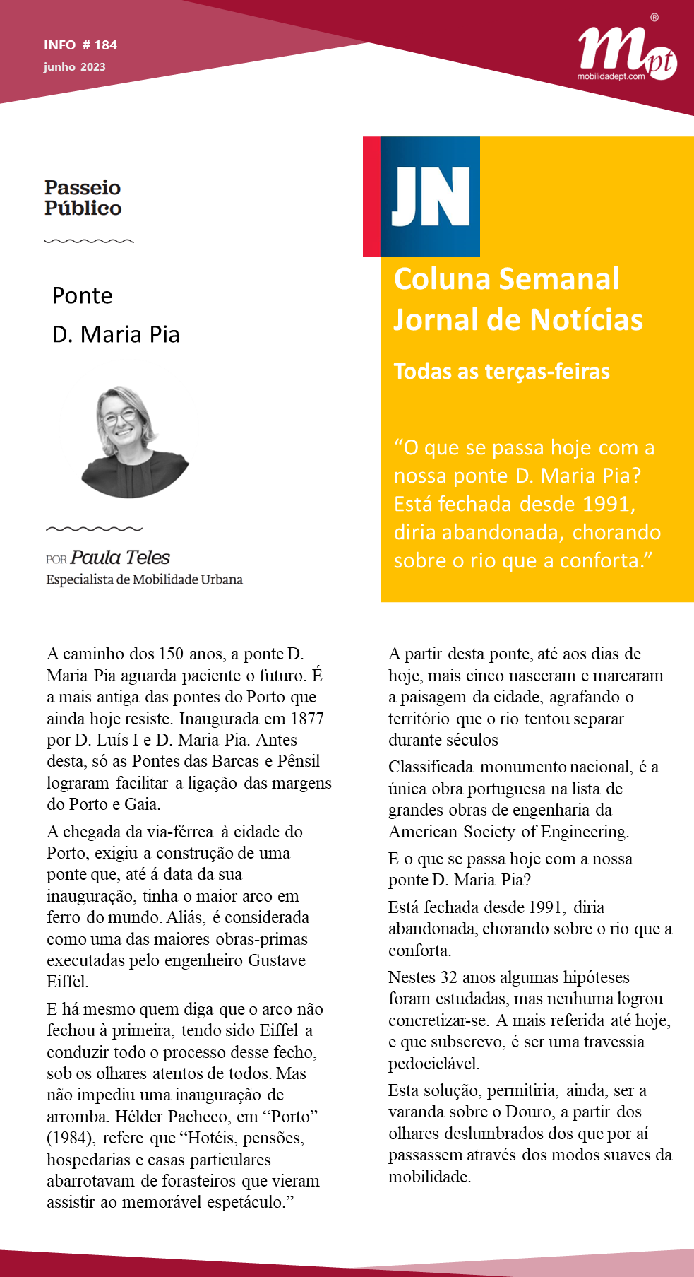 Esta terça-feira, na coluna semanal do JN, Paula Teles com o artigo de opinião “Ponte D. Maria Pia”