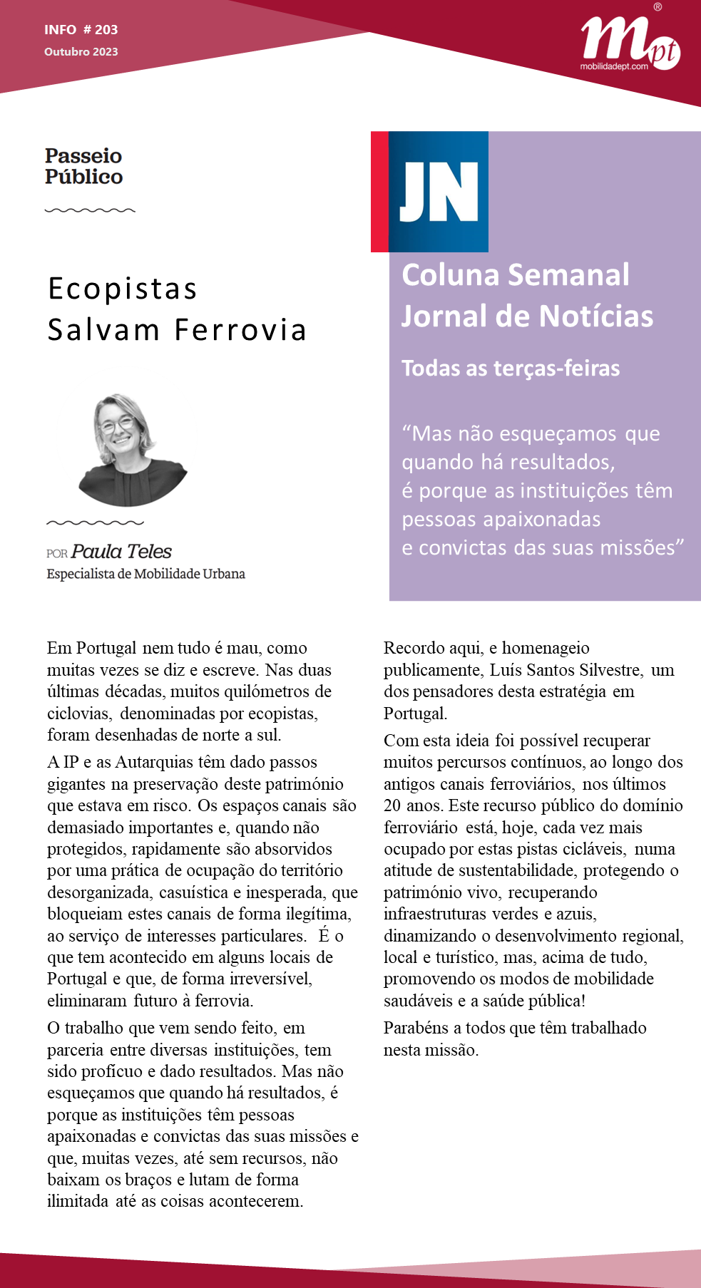 Esta terça-feira, na coluna semanal do JN, Paula Teles com o artigo de opinião Ecopistas Salvam Ferrovia