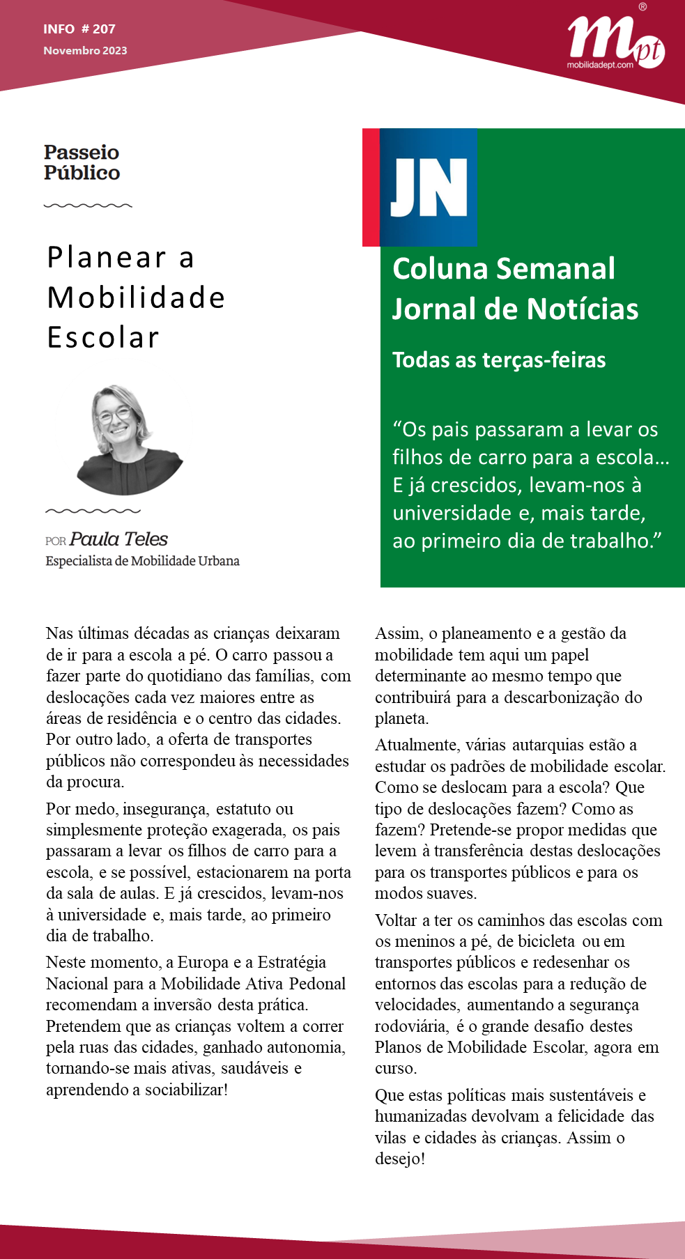 Esta terça-feira, na coluna semanal do JN, Paula Teles com o artigo de opinião “Planear a mobilidade escolar