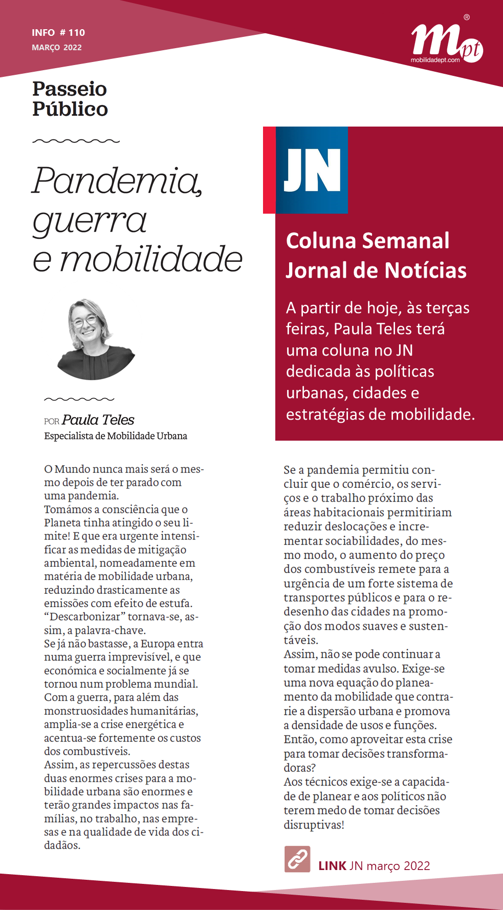 Paula Teles, todas as terças-feiras, terá uma coluna no JN dedicada às políticas urbanas, cidades e estratégias de mobilidade.