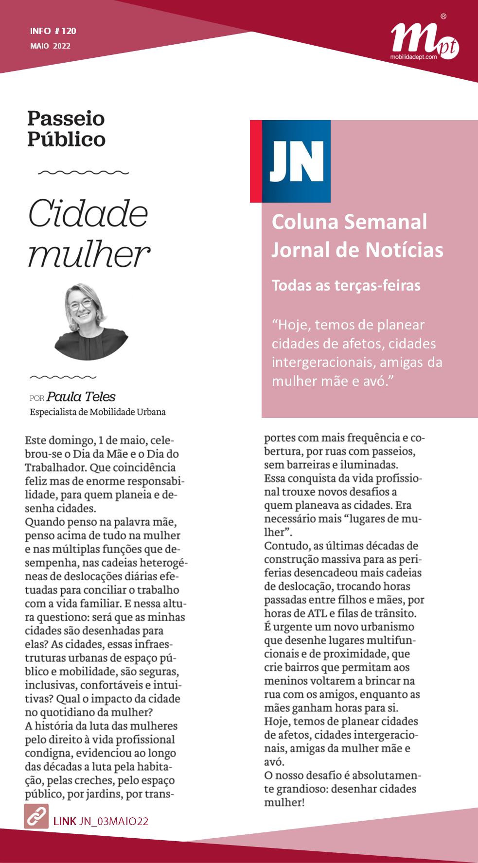 Paula Teles, esta terça-feira no JN, reforça o papal das mulheres nas cidades e a importância de as cidades estarem desenhadas de acordo com as necessidades destas.