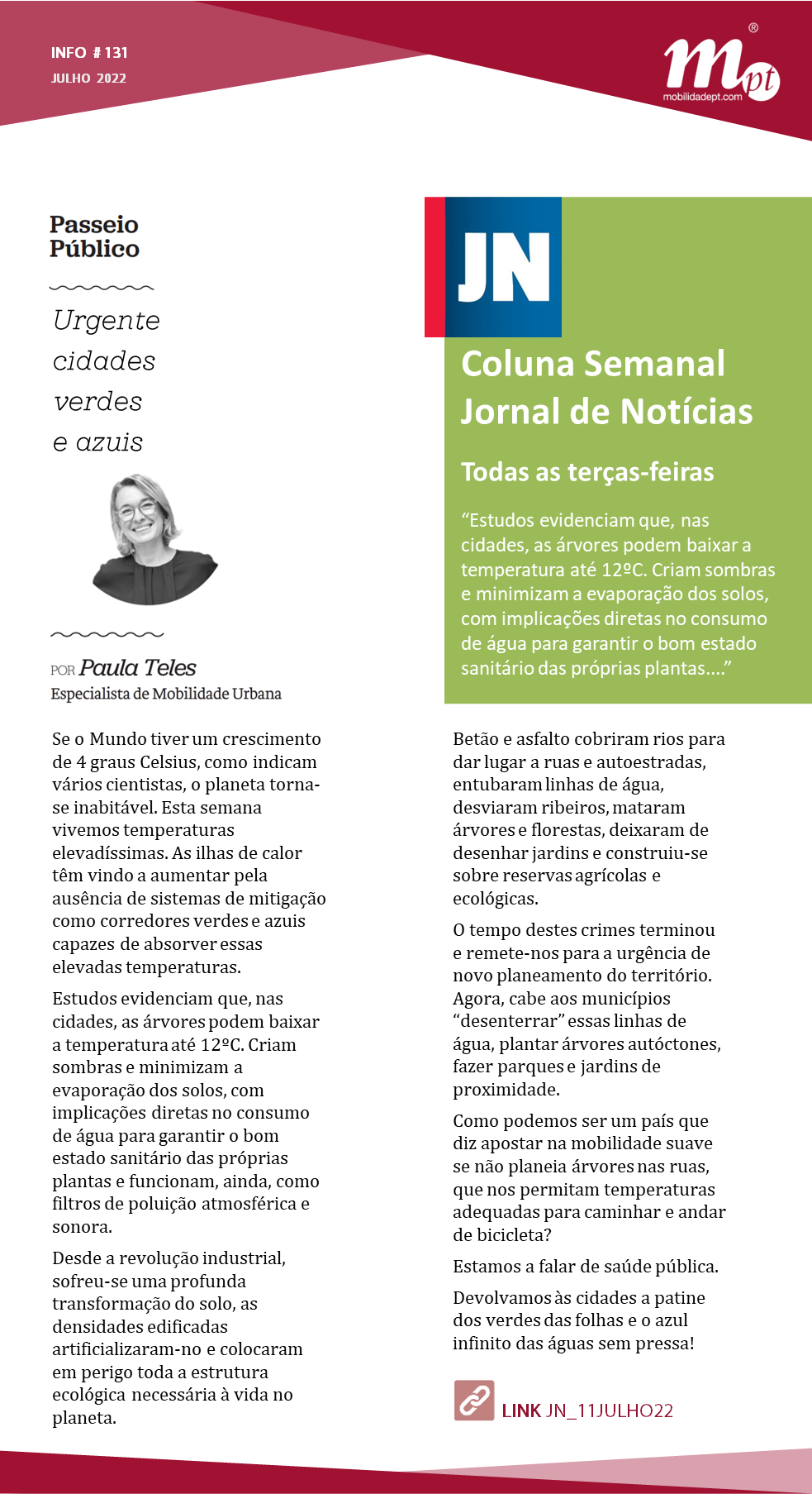 Face ao grande aumento de temperaturas que se tem vivido não só em Portugal mas em todo o mundo, Paula Teles esta semana apela à urgência de se planear o território apostando na plantação de árvores e no privilegiamento das linhas de água.