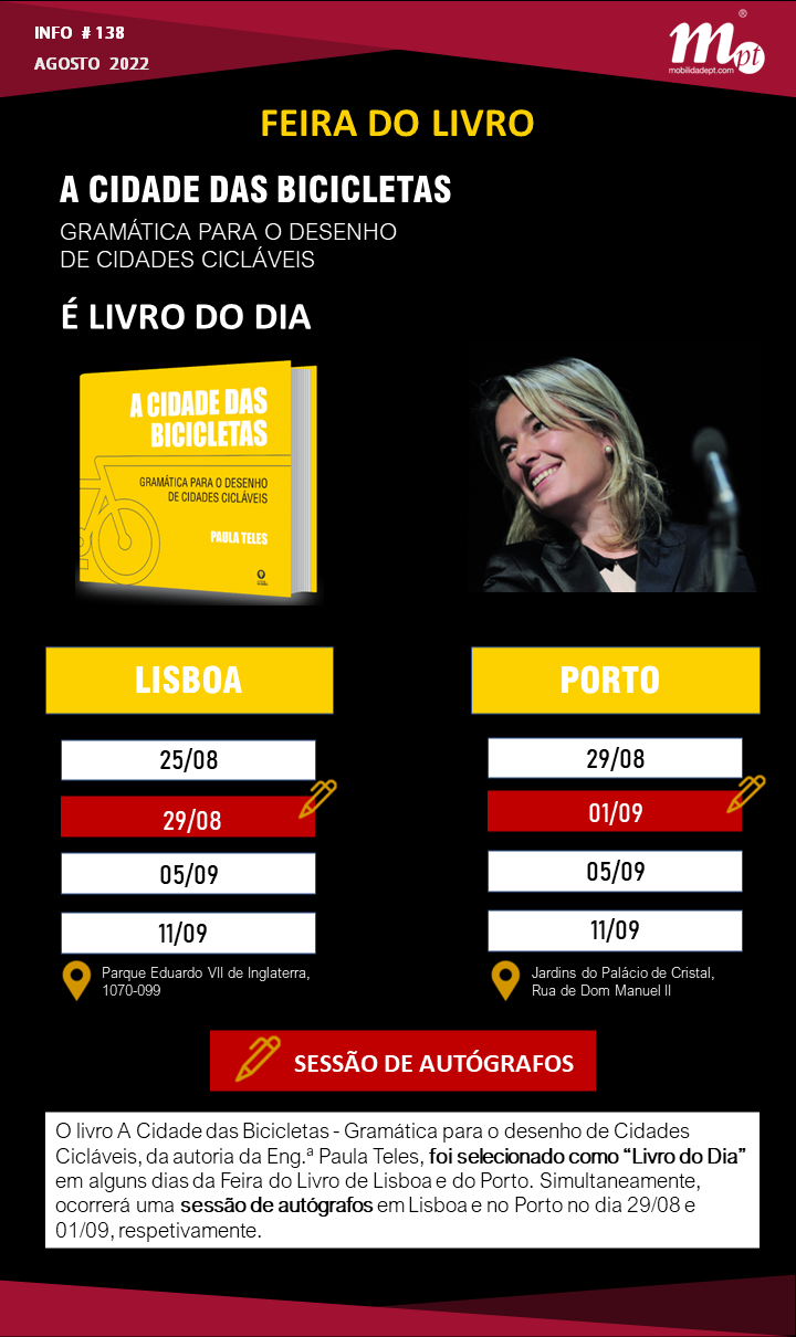 O livro A Cidade das Bicicletas - Gramática para o desenho de Cidades Cicláveis, da autoria da Eng.ª Paula Teles, vai ser o “Livro do Dia” na Feira do Livro de Lisboa e do Porto em alguns dias. Simultaneamente ocorrerá uma sessão de autógrafos em Lisboa e no Porto no dia 29/08 e 01/09, respetivamente.