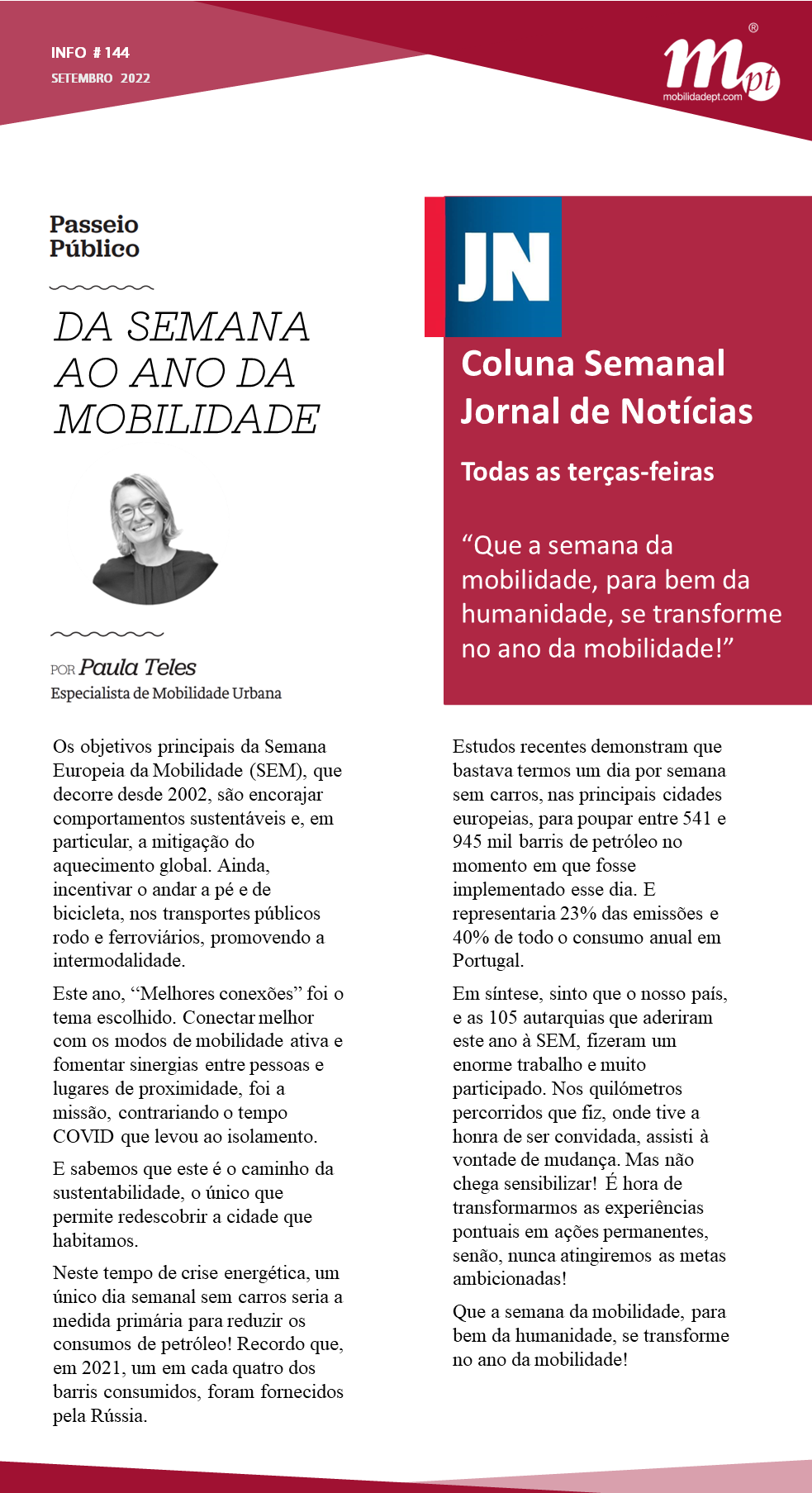 Se fosse determinado nas principais cidades da Europa, existir todas as semanas, um dia, em que não fossem utilizados carros, em que os cidadãos se deslocassem de forma pedonal ou em transportes públicos, essa medida representaria uma diminuição de 23% das emissões e 40% de todo o consumo anual em Portugal.
