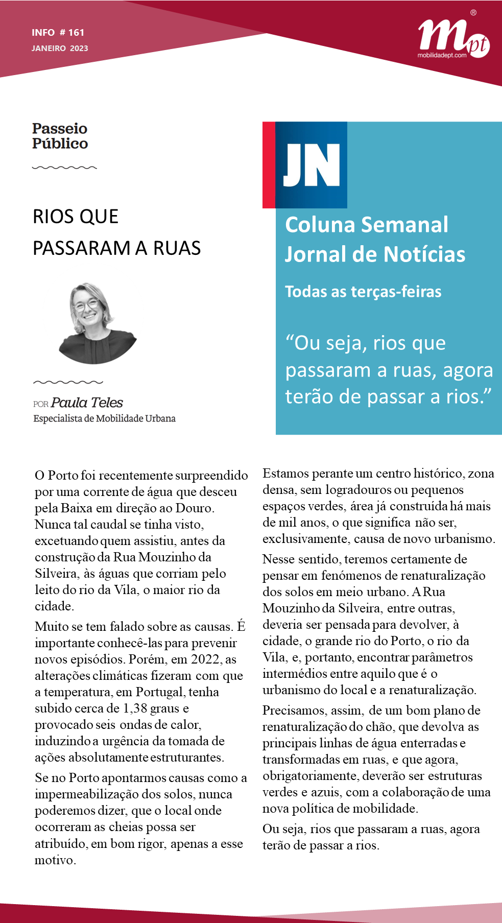 Esta terça-feira, na coluna semanal do JN, Paula Teles fala sobre a importância da criação de um “bom plano de renaturalização do chão, que devolva as principais linhas de água enterradas e transformadas em ruas, e que agora, obrigatoriamente, deverão ser estruturas verdes e azuis, com a colaboração de uma nova política de mobilidade.”