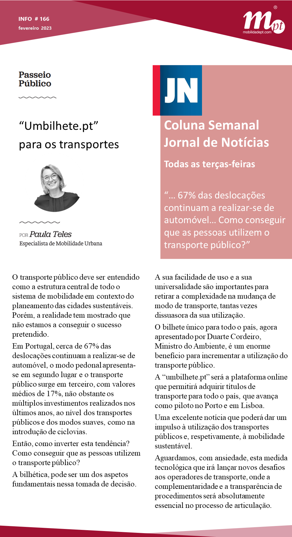 Esta terça-feira, na coluna semanal do JN, Paula Teles apresenta “Uma excelente notícia… a “umbilhete.pt” que será a plataforma online que permitirá adquirir títulos de transporte para todo o país, que avança como piloto no Porto e em Lisboa.”