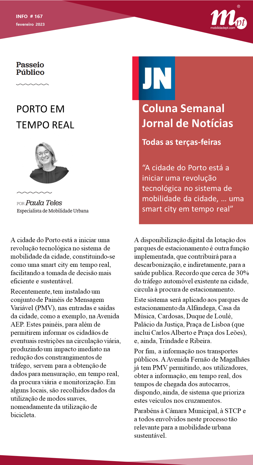 Esta terça-feira, na coluna semanal do JN, Paula Teles expõe a “revolução tecnológica no sistema de mobilidade da cidade do Porto, constituindo-se como uma smart city em tempo real, facilitando a tomada de decisão mais eficiente e sustentável.”