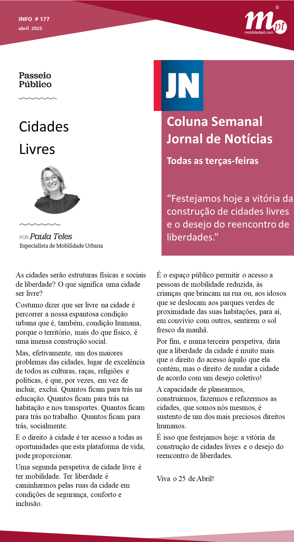 Esta terça-feira, na coluna semanal do JN, Paula Teles com o artigo de opinião “Cidades Livres“.