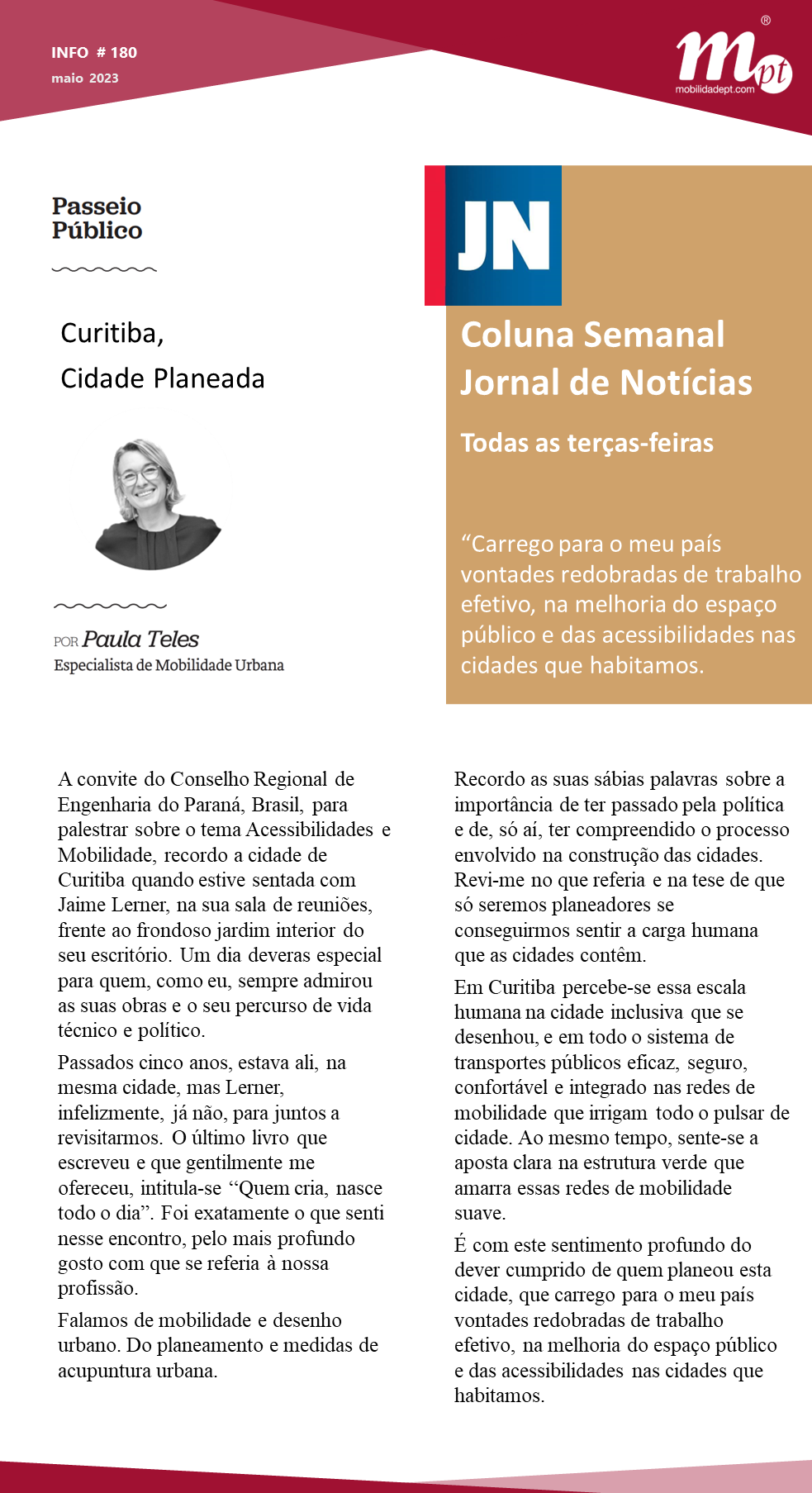 Esta terça-feira, na coluna semanal do JN, Paula Teles com o artigo de opinião “Curitiba, Cidade Planeada“