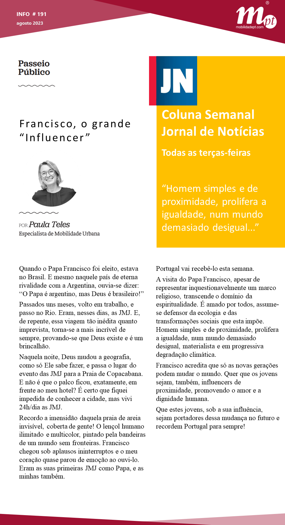 Esta terça-feira, na coluna semanal do JN, Paula Teles com o artigo de opinião Francisco, o grande “Influencer”