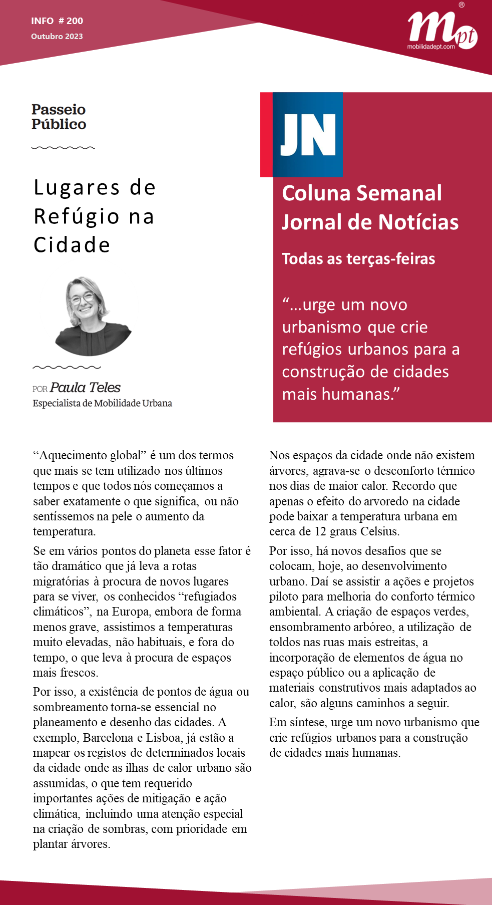 This Tuesday, in the weekly column of JN, Paula Teles with the opinion article Places of refuge in the city”