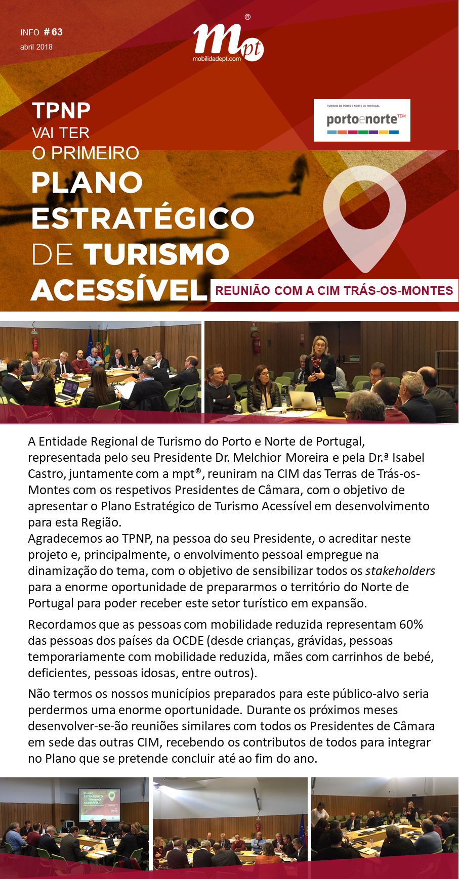 A Entidade Regional de Turismo do Porto e Norte de Portugal, representada pelo seu Presidente Dr. Melchior Moreira e pela Dr.ª Isabel Castro, juntamente com a mpt®, reuniram na CIM das Terras de Trás-os-Montes com os respetivos Presidentes de Câmara, com o objetivo de apresentar o Plano Estratégico de Turismo Acessível em desenvolvimento para esta Região.