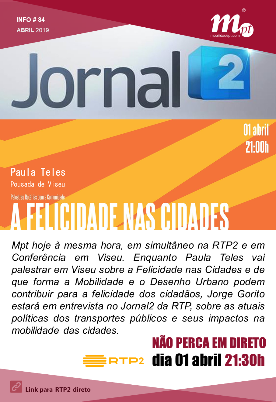 Mpt hoje à mesma hora, em simultâneo na RTP2 e em Conferência em Viseu. Enquanto Paula Teles vai palestrar em Viseu sobre a Felicidade nas Cidades e de que forma a Mobilidade e o Desenho Urbano podem contribuir para a felicidade dos cidadãos, Jorge Gorito estará em entrevista no Jornal2 da RTP, sobre as atuais políticas dos transportes públicos e seus impactos na mobilidade das cidades.